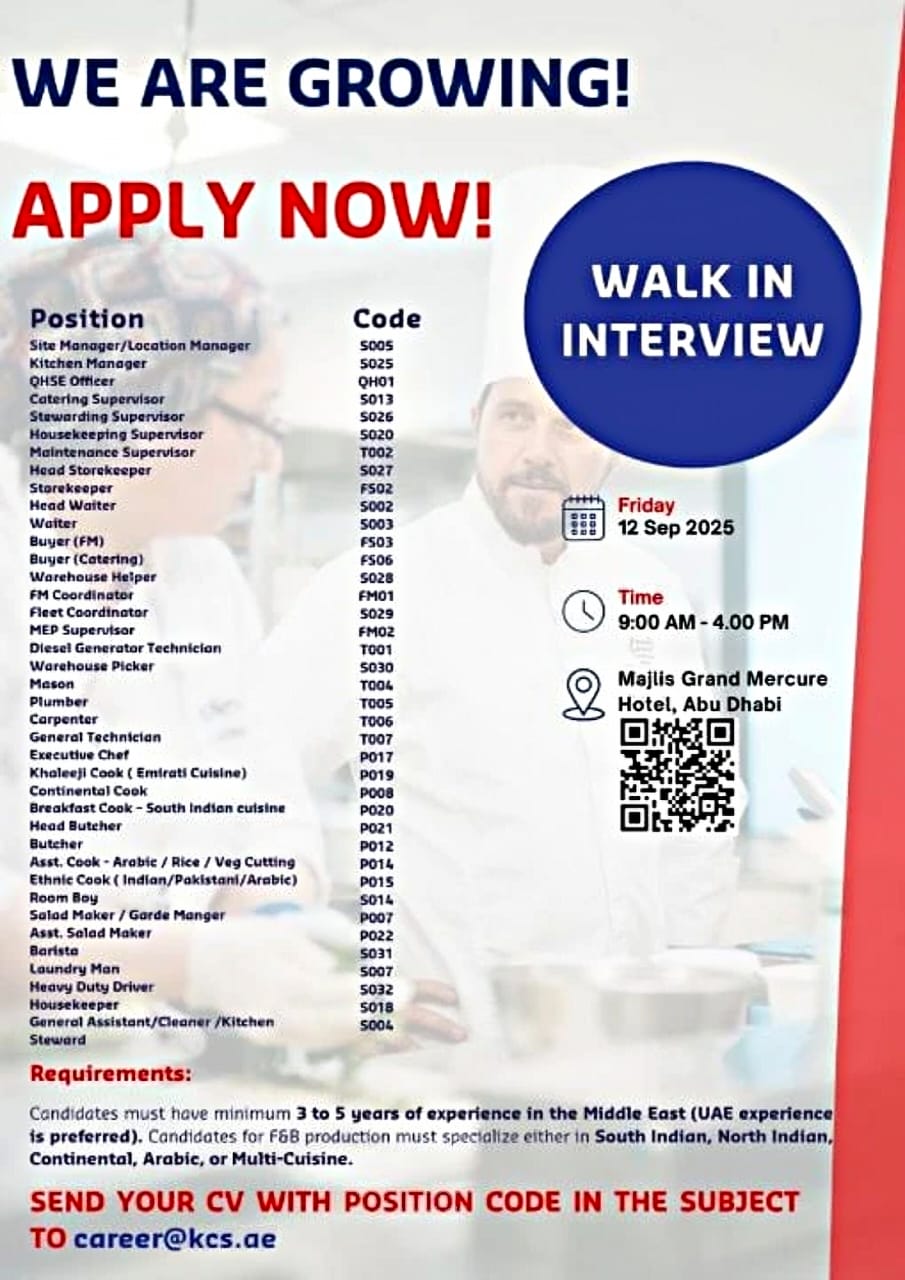 Candidates must have minimum 3 to 5 years of experience in the Middle East (UAE experience is preferred). Candidates for F&B production must specialize either in South Indian, North Indian, Continental, Arabic, or Multi-Cuisine.